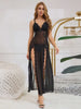 The plunging lace-trim neckline enhances your curves while adjustable straps ensure a perfect fit. A daring thigh-high slit trimmed in delicate scallop lace adds irresistible charm, making it the ultimate outfit for romantic nights or special occasions. The sheer maxi length offers just the right balance of coverage and seduction.