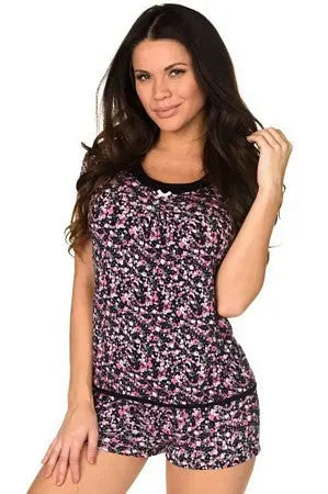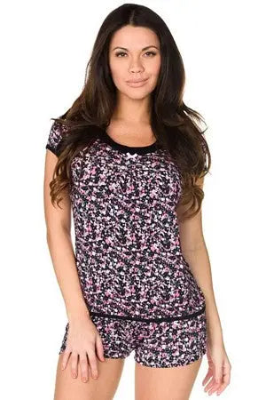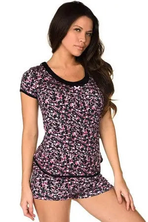 No need to count sheep in this irresistibly comfortable sleepwear set! Set includes a sleep shirt with cap sleeves, a wide scoop neck and satin bow detail, pleating at bust to accentuate your décolletage. Matching sleep shorts have an elastic waistband for comfort and satin bow detail. 95% Rayon, 5% Spandex
