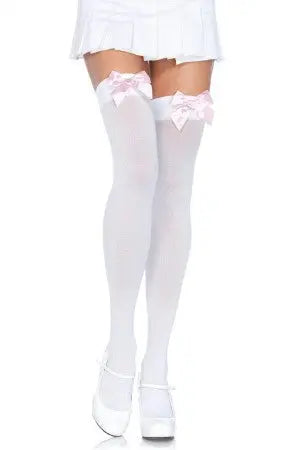 Add a flirty touch to your sexy costumes or favorite fashions with these opaque thigh highs adorned with a pretty satin bow. These comfortable white and pink nylon/lycra thigh highs are designed to fit and flatter your legs.