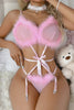 Pink Fluffy Feather Strappy Teddy - Sheer Mesh Bra Garter Thong