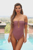This plum off the shoulder swimsuit features front cut out strappy details, high cut leg and full back.