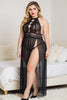 Queen Sheer Elegance Gown features lace cups with choker halter neckline, front bow detailing, high front slit, open back and thong.